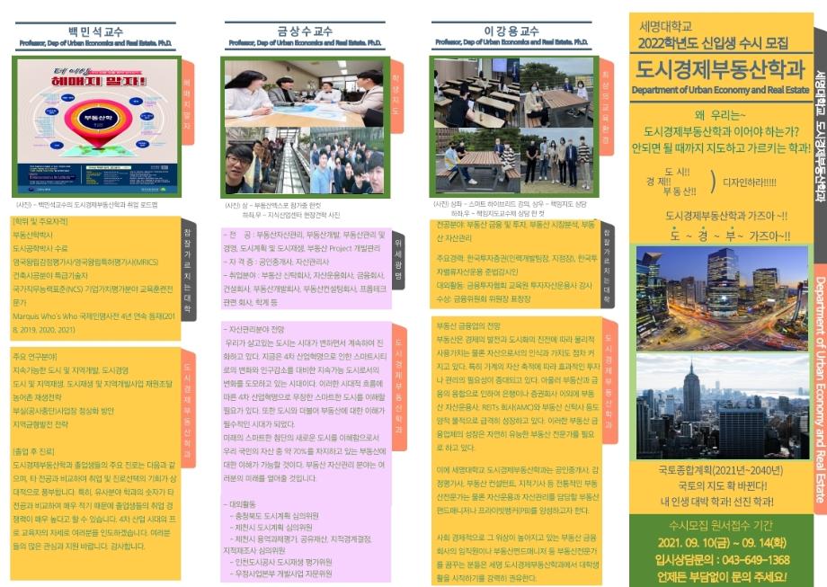 본문 시작 홈으로 학과 소식 학과소개 취업 및 진로 언론 및 보도 학과 소식 대학원 홈페이지가이드 행사사진게시판 행사사진게시판 공지사항 일반자료실 강의자료실 부동산학보 동아리 행사사진게시판 페이스북 트위터 프린트 학과명칭 변경 도시경제부동산학과 홍보리플렛 부동산학과 2940 2021-06-16 세명대학교 부동산학과가 2022학년도 '도시경제부동산학과'로 새롭게 탄생합니다. 세명대학교 부동산학과가 2022년 '도시경제부동산학과'로 새롭게 탄생합니다. 격변하는시대에 맞춰 전문적이고 수준높은 교육을 위하여 도시경제부동산학과가 여러분들과 함께 할 것입니다. 작성자 : 부동산학과 조교 목록 이전학과장님과 다빈학생회! 다음 한국법이론실무학회활동하는 도경제부동산학과 김상진교수 담당부서 : 부동산지적학과 담당자 : - 연락처 : 043-649-1369 최종수정일 : 2024-10-26 만족도조사 만족도 조사 이 페이지에서 제공하는 정보에 대하여 만족하시나요? 매우만족 만족 보통 불만족 매우불만족