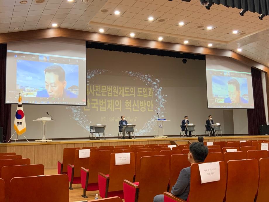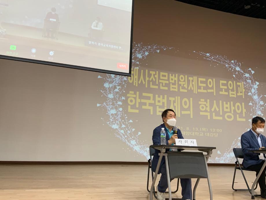 2021년 8월 13일 부산시, 한국법학회 및 한국해양대 한·중해사법연구센터와 공동으로 학술대회에 김상진 학과장님께서 사회자로 학회참석하셨습니다. 학술대회는 온라인과 오프라인 동시진행되었으며, 최근 국회에서 논의 중인 해사전문법원제도의 도입과 관련해 부산지역에 해사전문법원을 설립하는 것이 타당한가라는 주제와 함께 한국법제의 혁신방안을 놓고 학계·법조계·해운실무계의 전문가들이 모여 깊이 있는 발제와 토론을 펼쳤습니다.