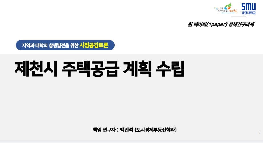 제천시는 관내 대학교수 및 대학 산하기관 소속 연구원 등을 대상으로 추진한 '원 페이퍼(1paper) 정책 연구과제 공모'에서 총 23건의 정책 제안이 되었고 그중 우리 학과 교수님들의 제안이 최종 선정됐습니다.