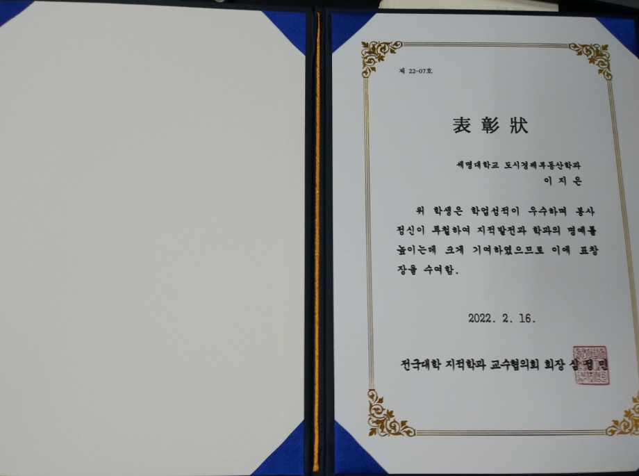 본문 시작 홈으로 학과 소식 학과소개 취업 및 진로 언론 및 보도 학과 소식 대학원 홈페이지가이드 행사사진게시판 행사사진게시판 공지사항 일반자료실 강의자료실 부동산학보 동아리 행사사진게시판 페이스북 트위터 프린트 2021학년도 전기 졸업자 표창 수상 도시경제부동산학과 2020 2022-02-09 2021학년도 전기 졸업자 표창 수상 안내입니다. 한국지적정보학회 학회장상 : 최유정 한국국토정보공사 사장표창 : 이현지 전국대학 지적학과 교수협의회 우수학생표창 : 이지은 부동산학과 수상자 여러분 모두 진심으로 축하드립니다. 각 수상자는 우편으로 표창장을 발송 할 예정입니다. 작성자 : 디지털홍보특별채용 조교 목록 이전2021학년도 전기 졸업자 표창 수상 다음 2021학년도 전기 졸업식 담당부서 : 부동산지적학과 담당자 : - 연락처 : 043-649-1369 최종수정일 : 2024-10-26 만족도조사 만족도 조사 이 페이지에서 제공하는 정보에 대하여 만족하시나요? 매우만족 만족 보통 불만족 매우불만족