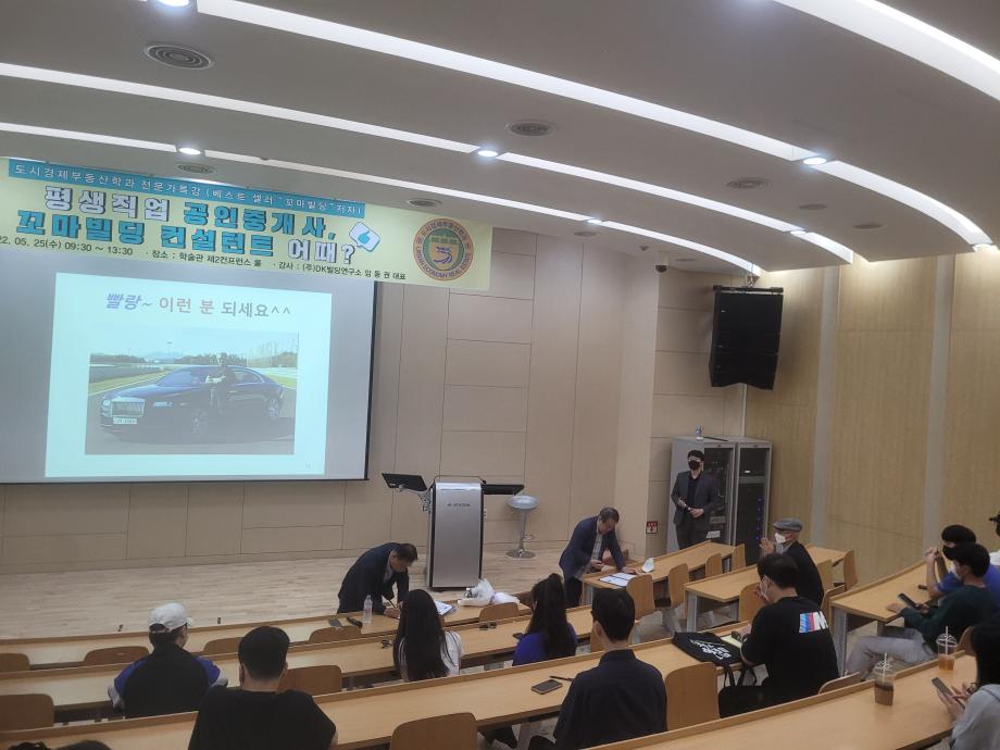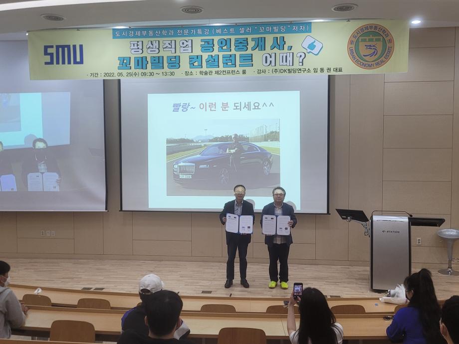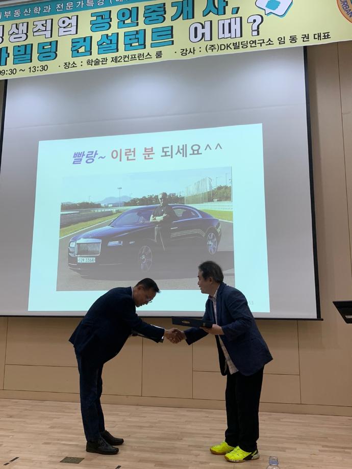 * 내용 : DK빌딩연구소 임동권 대표님께서 도시경제 부동산학과 학생들을 위해 업무협약을 체결했습니다. 협력기관 상호간(도시경제부동산학과, DK빌딩연구소) 학생들의 개인발전에 기여함을 목적으로 교육 콘텐츠 할인 제공, 기타 양 기관의 협정 목적에 적합한 교육콘텐츠 개발 및 제공을 하기로 했습니다. 도시경제부동산학과 학생들의 발전을 위하여 노력해주시는 김상진 학과장님과 임동권 대표님게 감사말씀 드립니다.