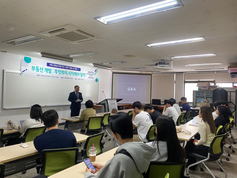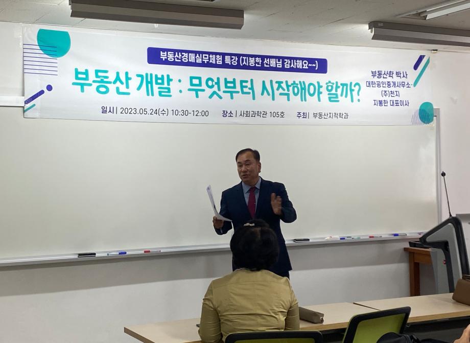 내용 : 대한공인중개사무소 지봉한 대표님은 부동산경매실무에 특강을 해주셨습니다. 학교에서 배우기 어려운 부동산 개발을 현장 실무자의 관점에서 부동산개발사업을 사례와 함께 구체적으로 설명을 해주셨습니다. 학생들은 부동산 개발 ,토지분야의 진로에 깊이 고민하고 답을 얻는 시간이였다고 생각합니다.