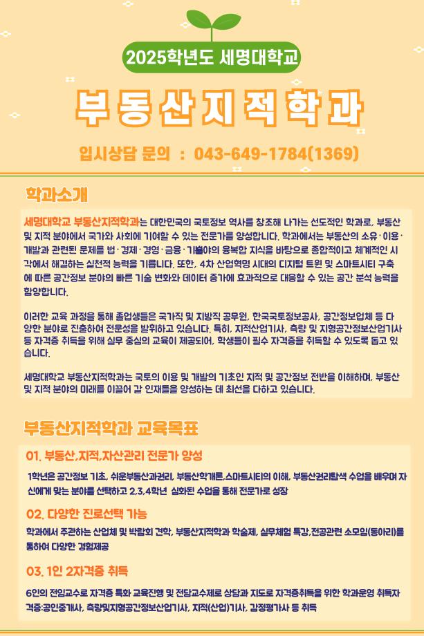 안녕하세요. 세명대학교 부동산지적학과입니다.