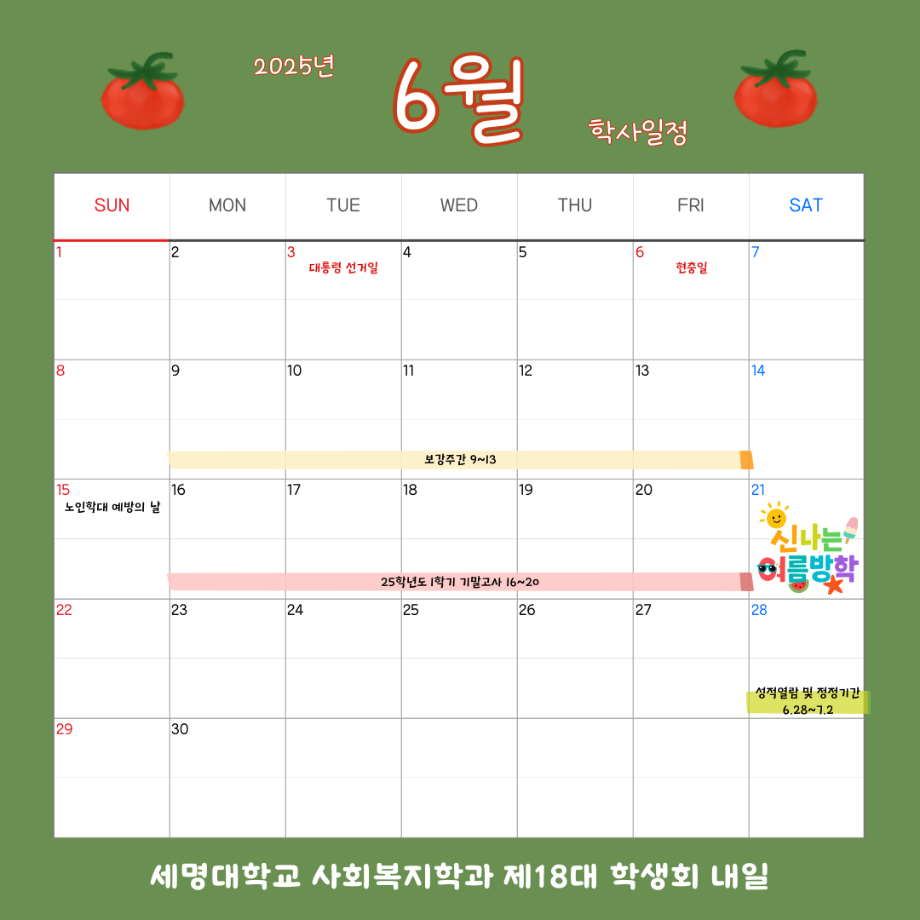 본문 시작 홈으로 커뮤니티 학과소개 교수소개 교육과정 현장실습 및 취업정보 커뮤니티 홈페이지가이드 학사일정 학과공지 학사일정 학생회 동아리 학생 소통 광장 포토갤러리 전공자료실 서식자료실 학사일정 페이스북 트위터 프린트 6월 학사 일정 사회복지학과 337 2025-09-04 2025학년도 6월 학사 일정입니다. 목록 이전5월 학사 일정 다음 8월 학사 일정 담당부서 : 사회복지학과 담당자 : - 연락처 : 043-649-1799 최종수정일 : 2024-10-26 만족도조사 만족도 조사 이 페이지에서 제공하는 정보에 대하여 만족하시나요? 매우만족 만족 보통 불만족 매우불만족