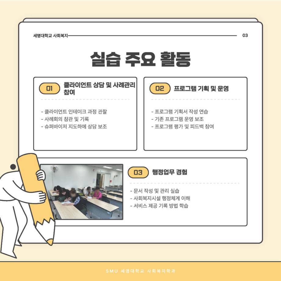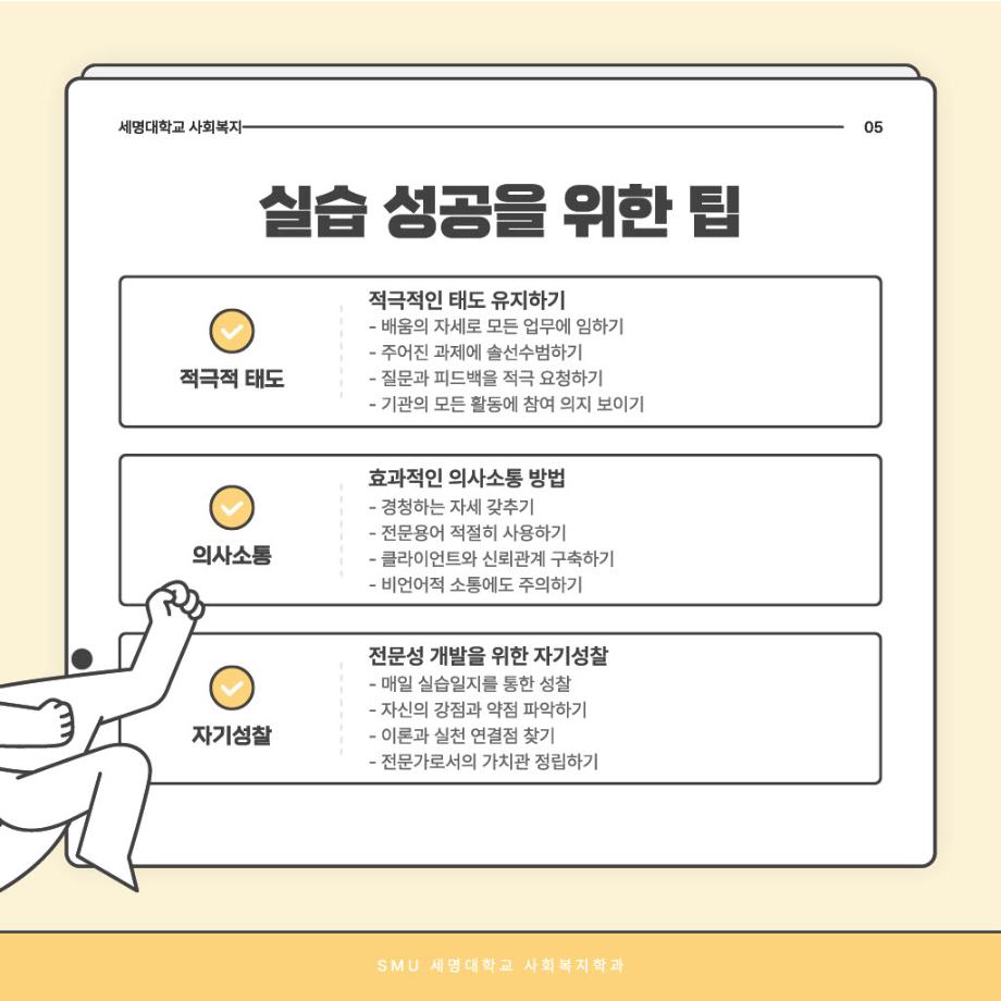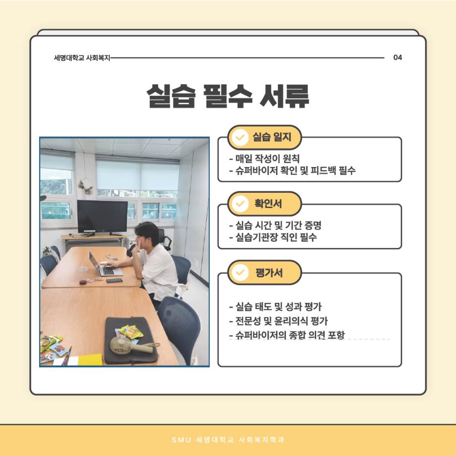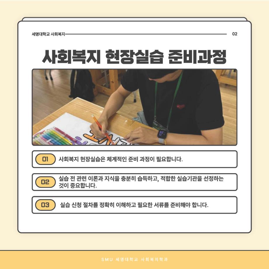 본문 시작 홈으로 커뮤니티 학과소개 교수소개 교육과정 현장실습 및 취업정보 커뮤니티 홈페이지가이드 학생 소통 광장 학과공지 학사일정 학생회 동아리 학생 소통 광장 포토갤러리 전공자료실 서식자료실 학생 소통 광장 페이스북 트위터 프린트 사회복지현장실습 과정 안내 사회복지학과 706 2025-09-03 오늘은 '사회복지현장실습 과정 안내'편입니다~ 목록 이전사회복지현장실습 알고 가자! 다음 중간고사 응원 간식나눔 담당부서 : 사회복지학과 담당자 : - 연락처 : 043-649-1799 최종수정일 : 2024-10-26 만족도조사 만족도 조사 이 페이지에서 제공하는 정보에 대하여 만족하시나요? 매우만족 만족 보통 불만족 매우불만족