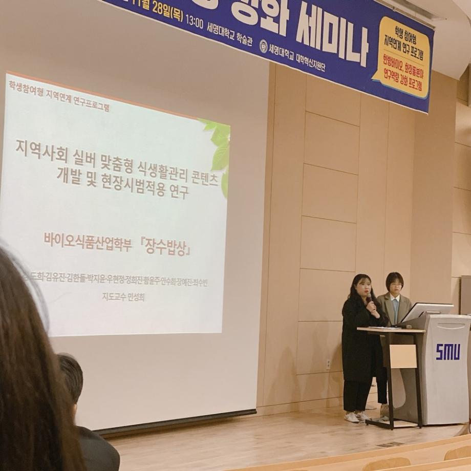 본문 시작 홈으로 커뮤니티 학부소개 진로·취업 교육과정 커뮤니티 대학원 입학상담 홈페이지가이드 갤러리 공지사항 문의게시판 학생회 전공동아리 동문회 갤러리 전공자료실 Youtube Instagram Facebook Blog 갤러리 페이스북 트위터 프린트 학생참여형 지역연계 연구 최종 발표 및 장려상 수상 바이오식품산업학부 6321 2019-12-02 2019년 11월 28일 (목) 학생참여형 지역연계연구 최종 발표회가 있었습니다. 우리 학부에서 참여한 '장수밥상'팀에서는 오후 1시30분부터 3시30분까지 학술관 로비에서 포스터 발표를 하였고 3시30분 부터는 학술관 102호에서 연구성과 제발표(발표자 3학년 우현정)를 하였고 장려상을 수상하였습니다 목록 이전학생경험중심 발표회 다음 [실험조리] 수강생 학부 발전기금 기부 담당부서 : 바이오식품산업학부 담당자 : - 연락처 : 043-649-1431 최종수정일 : 2024-10-26 만족도조사 만족도 조사 이 페이지에서 제공하는 정보에 대하여 만족하시나요? 매우만족 만족 보통 불만족 매우불만족