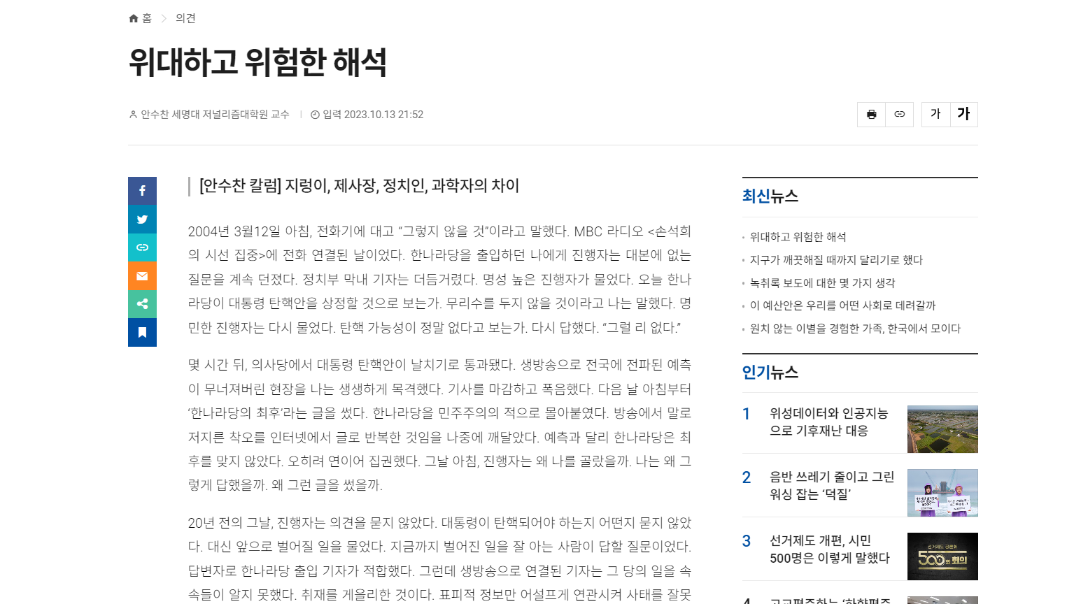안수찬 세명대 저널리즘 교수는 기자의 해석이 지렁이, 제사장, 정치인, 과학자 가운데 누구의 것을 닮아야 하는지 뒤늦게 깨달았다.