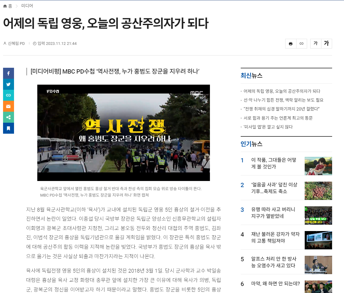 <역사 전쟁, 왜 홍범도 장군을 지우려 하나>라는 제목에서 알 수 있듯이 MBC