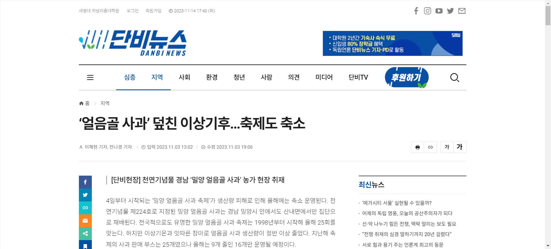4일부터 시작되는 ‘밀양 얼음골 사과 축제’가 생산량 피해로 인해 올해에는 축소 운영된다. 천연기념물 제224호로 지정된 밀양 얼음골 사과는 경남 밀양시 안에서도 산내면에서만 집단으로 재배된다. 전국적으로도 유명한 밀양 얼음골 사과 축제는 1998년부터 시작해 올해 25회를 맞는다. 하지만 이상기온과 잇따른 장마로 얼음골 사과 생산량이 절반 이상 줄었다. 지난해 축제의 사과 판매 부스는 25개였으나 올해는 9개 줄인 16개만 운영될 예정이다.