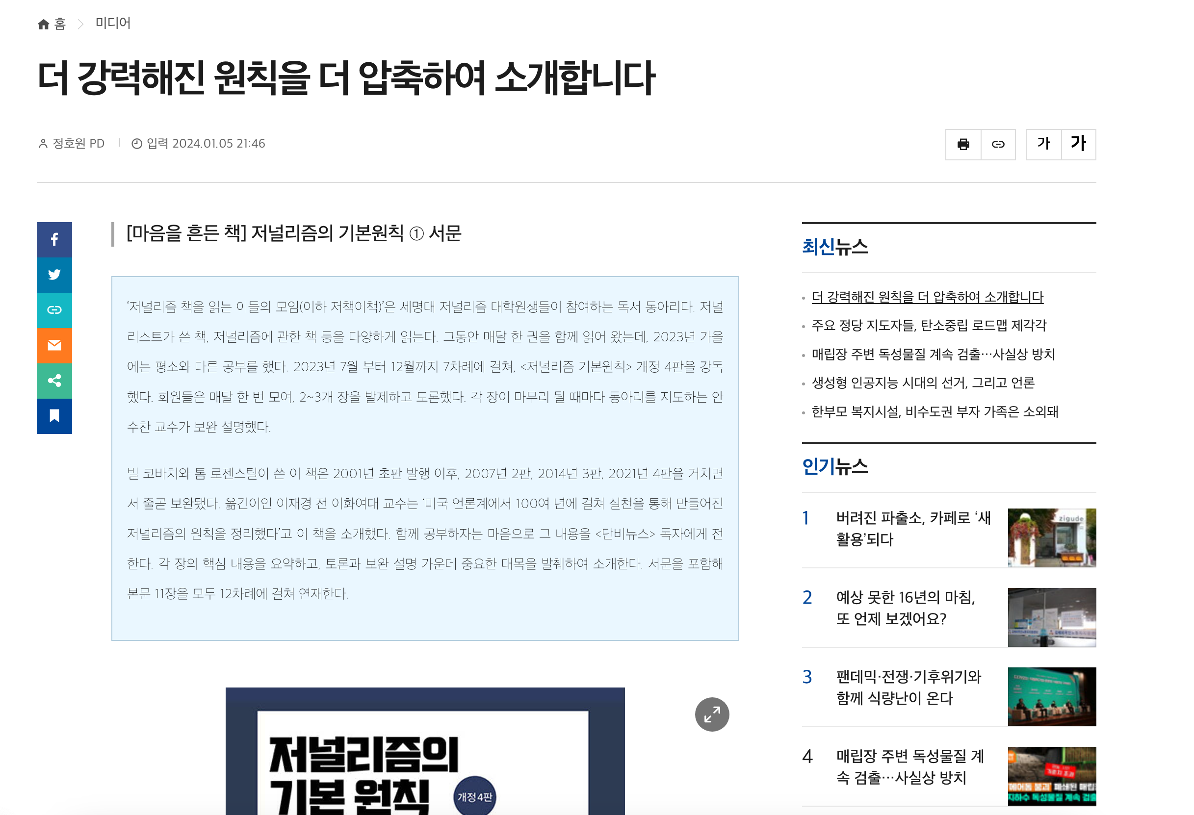 2023년 7월 부터 12월까지 7차례에 걸쳐, <저널리즘 기본원칙> 개정 4판을 강독했다.