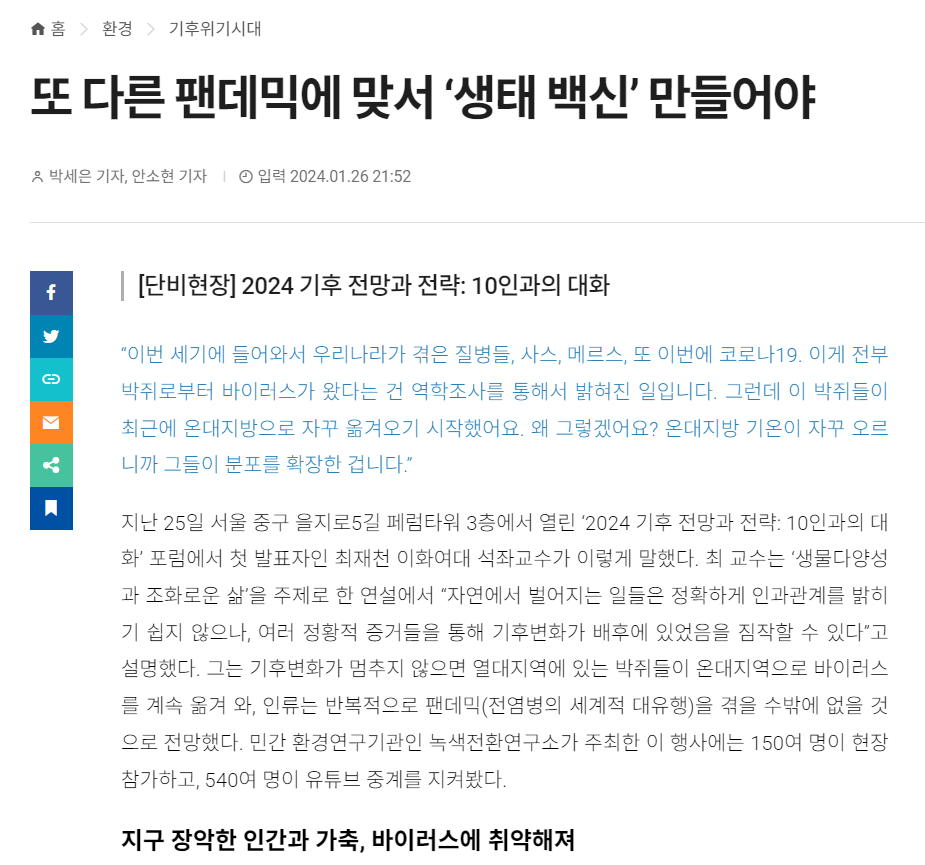 이번 포럼에는 생물다양성 연구의 권위자인 최재천 교수와 초대 국립기상과학원장을 역임한 조천호 교수 등 다양한 연사가 참여해 인류가 맞닥뜨린 기후위기 현실에 대해 발표했습니다.
