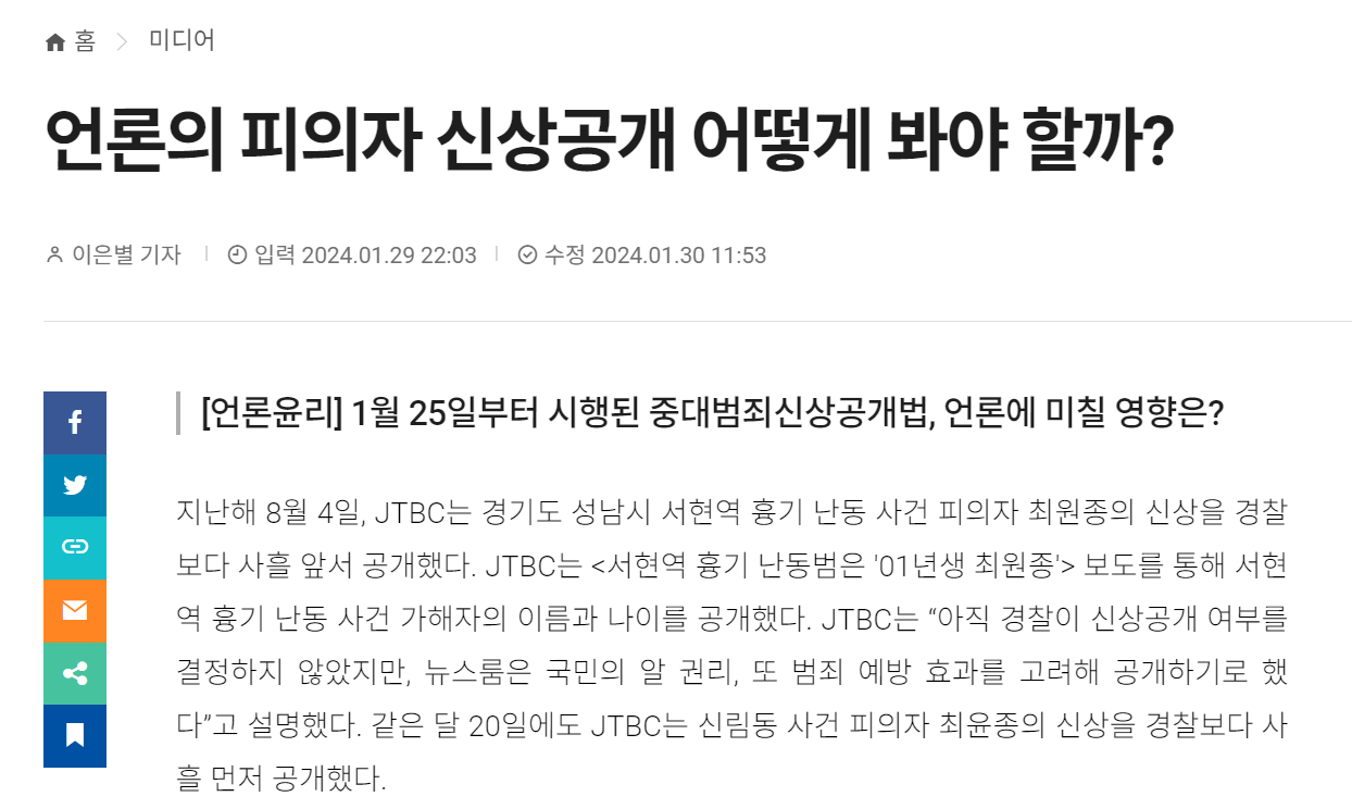이에 피의자의 신상을 공개하라는 국민적 요구가 빗발쳤고, 언론사는 경찰보다 먼저 피의자의 신상을 공개하는 보도를 하며 논란의 중심에 서기도 했습니다.