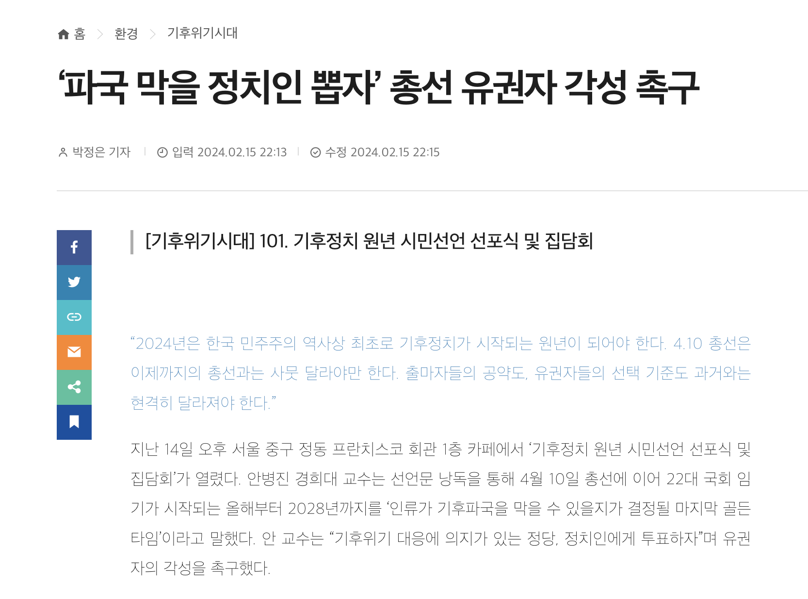안 교수는 “기후위기 대응에 의지가 있는 정당, 정치인에게 투표하자”며 유권자의 각성을 촉구했다.