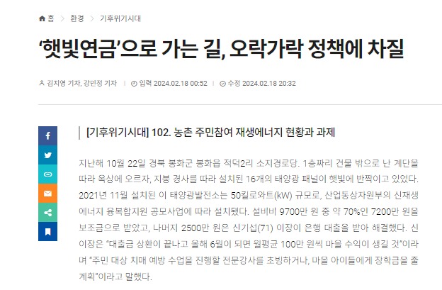 ‘햇빛연금’으로 가는 길, 오락가락 정책에 차질