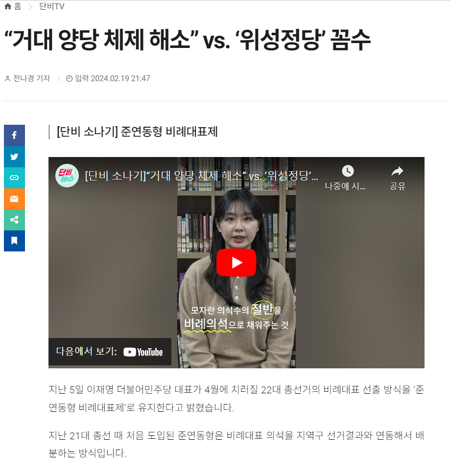 지난 5일 이재명 더불어민주당 대표가 4월에 치러질 22대 총선거의 비례대표 선출 방식을 ‘준연동형 비례대표제’로 유지한다고 밝혔습니다.