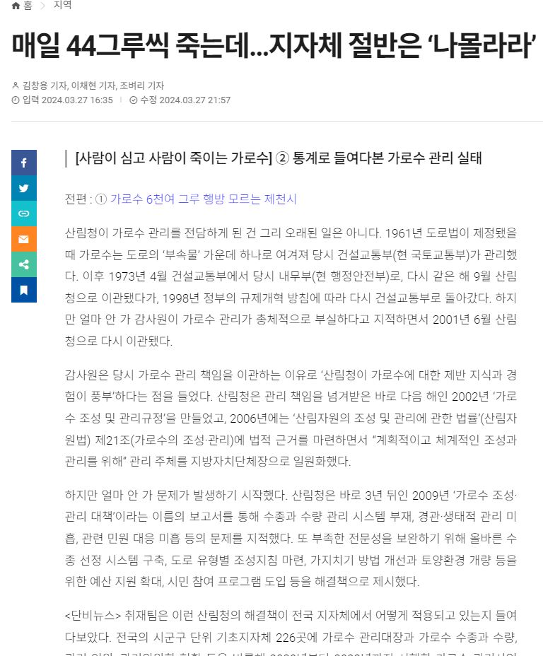절반에 가까운 지자체가 가로수가 얼마나 죽는지조차 관리하지 않고 있기 때문입니다.