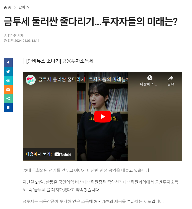지난달 24일, 한동훈 국민의힘 비상대책위원장은 중앙선거대책위원회의에서 금융투자소득세, 즉 ‘금투세’를 폐지하겠다고 약속했습니다.
