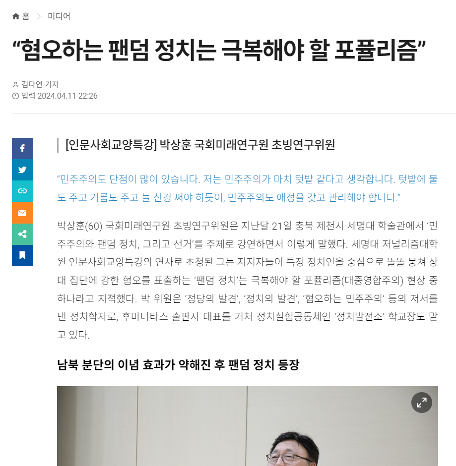 세명대 저널리즘대학원 인문사회교양특강의 연사로 초청된 그는 지지자들이 특정 정치인을 중심으로 똘똘 뭉쳐 상대 집단에 강한 혐오를 표출하는 ‘팬덤 정치’는 극복해야 할 포퓰리즘(대중영합주의) 현상 중 하나라고 지적했습니다.