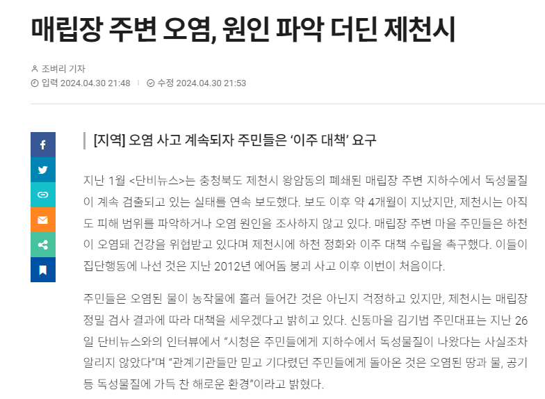 지난 1월 <단비뉴스>는 충청북도 제천시 왕암동의 폐쇄된 매립장 주변 지하수에서 독성물질이 계속 검출되고 있는 실태를 연속 보도했다.