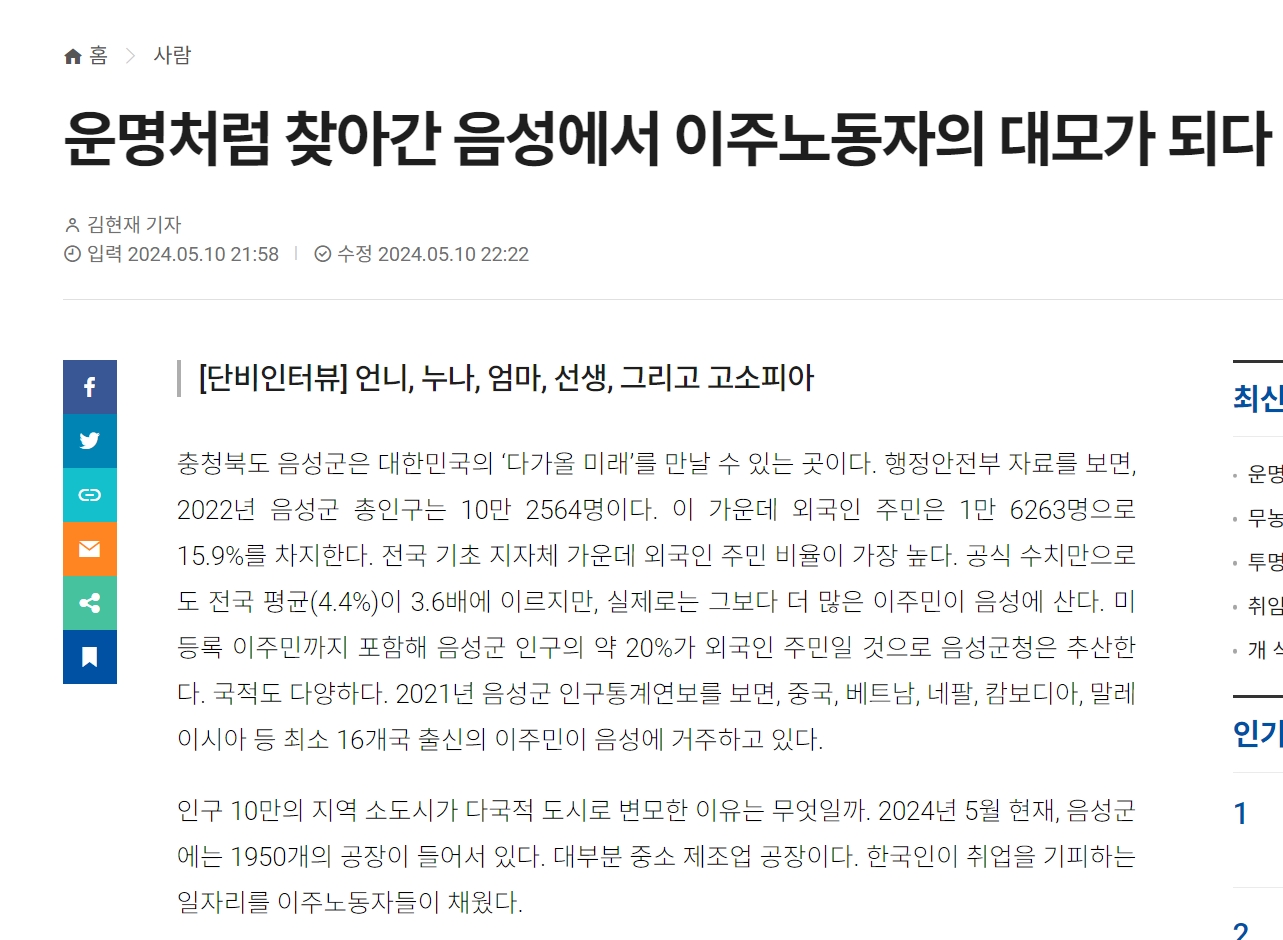 <단비뉴스>는 음성군을 방문해 이주노동자들의 언니, 누나, 엄마, 선생님이 되어준 그의 이야기를 들어보았다.