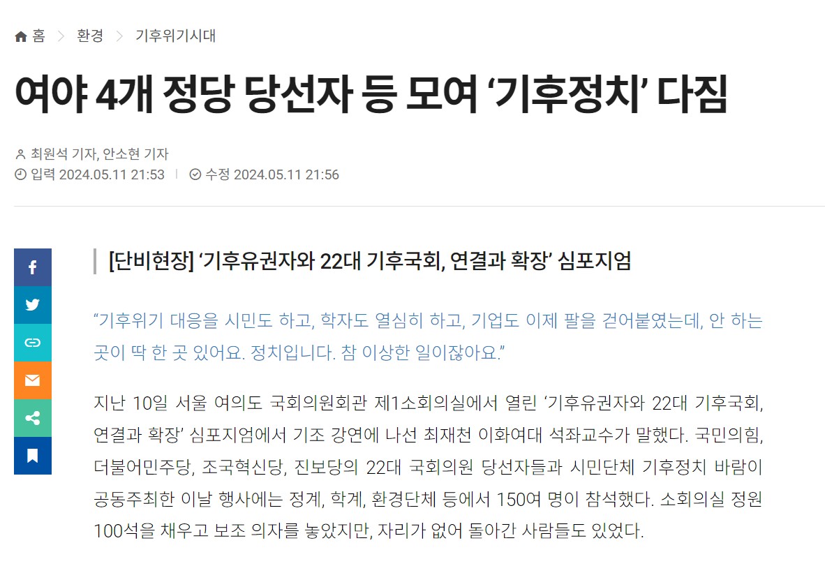 지난 10일, 여야 정치인들은 모여 "22대 국회를 기후국회로 만들겠다"고 다짐했습니다.