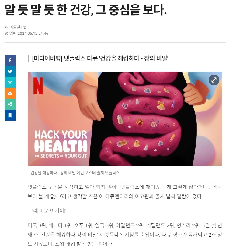 지난 4월 말, 넷플릭스 다큐멘터리, 건강을 해킹하다 - 장의 비밀이 공개되었습니다.