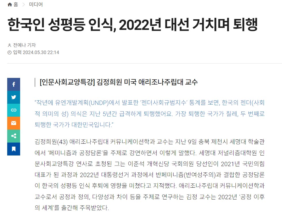 김정희원 미국 애리조나주립대 커뮤니케이션학과 교수는 지난 9일 충북 제천시 세명대 학술관에서 ‘페미니즘과 공정담론’을 주제로 강연했습니다.