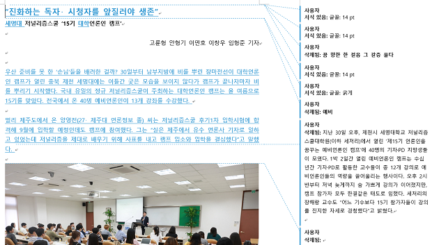 <단비뉴스>에 올라오는 기사의 원본과 최종본은 얼마나 차이날까요? 교수님들이 어떻게 기사를 수정하셨는지 배우고 싶으면 이곳 '단비뉴스 편집실'에 자주 들어오세요. 첨삭한 원본과 수정본, 그리고 교수님들의 코멘트를 보실 수 있습니다.