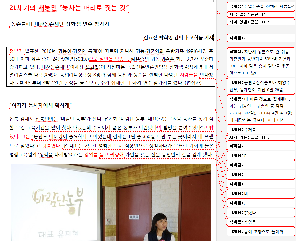 <단비뉴스>에 올라오는 기사의 원본과 최종본은 얼마나 차이날까요? 교수님들이 어떻게 기사를 수정하셨는지 배우고 싶으면 이곳 '단비뉴스 편집실'에 자주 들어오세요. 첨삭한 원본과 수정본, 그리고 교수님들의 코멘트를 보실 수 있습니다.