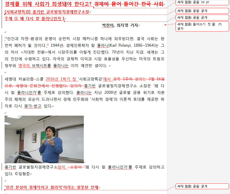오늘은 최지영 박찬이 기자의 <사회교양특강> 강연 기사입니다. 홍기빈 글로벌정치경제연구소장의 '왜 다시 칼 폴라니인가'를 주제로 한 강의를 듣고 썼습니다. 경제에 '묻어 들어간' 한국 사회를 진단했는데요. 자세한 내용은 기사를 통해 확인하세요!