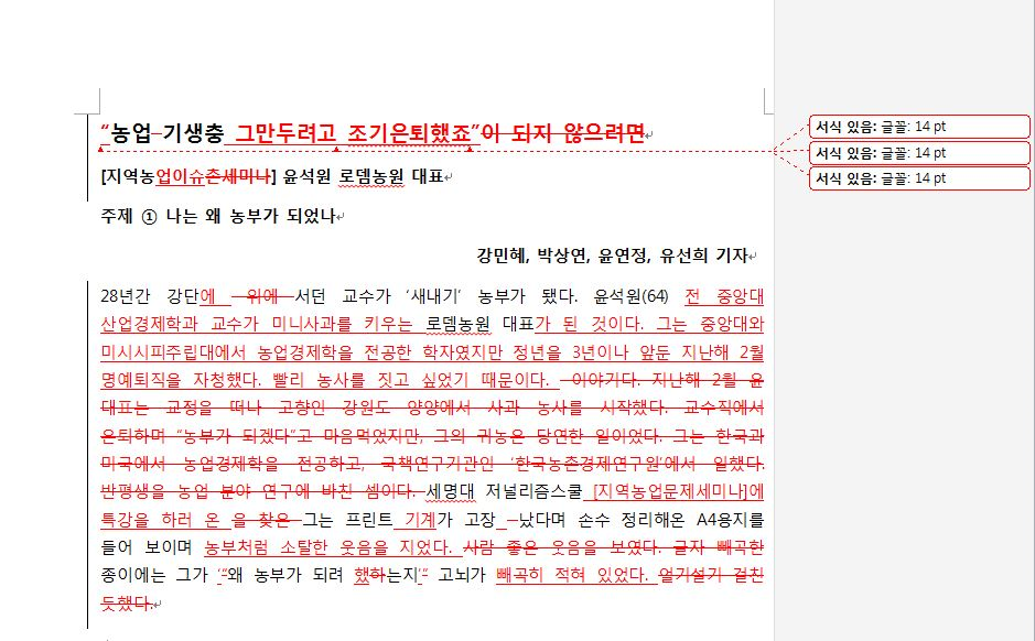 <단비뉴스>에 올라오는 기사의 원본과 최종본은 얼마나 차이날까요? 교수님들이 어떻게 기사를 수정하셨는지 배우고 싶으면 이곳 '단비뉴스 편집실'에 자주 들어오세요. 첨삭한 원본과 수정본, 그리고 교수님들의 코멘트를 보실 수 있습니다.