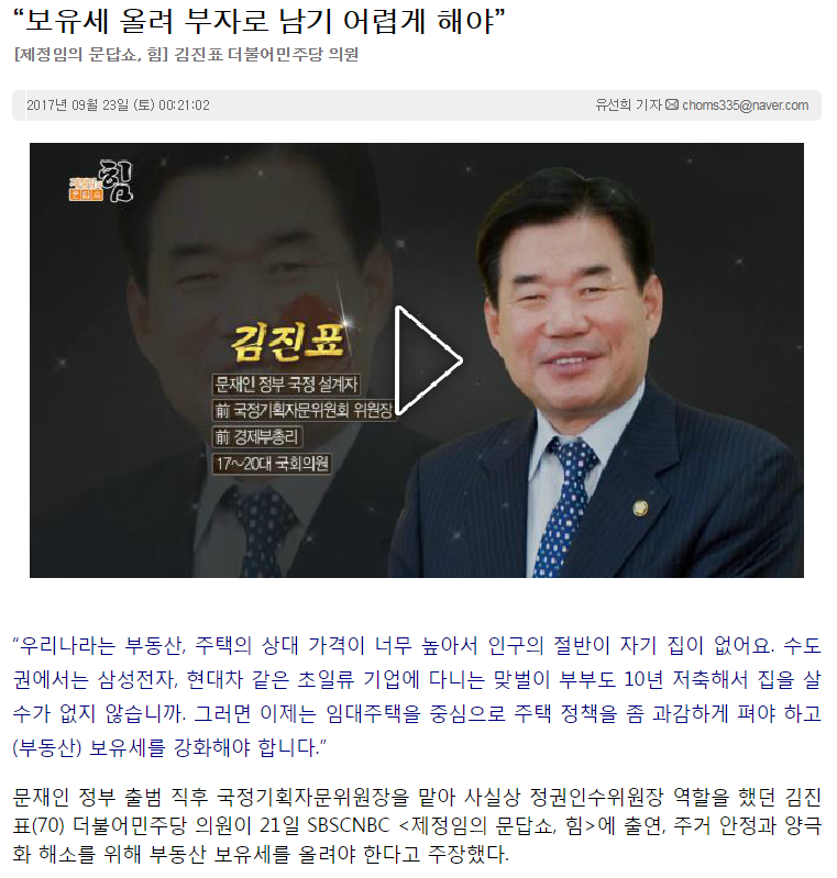 본문 시작 게시판 대학원소개 교수/학생소개 교과과정 입학/학사안내 공지사항 게시판 저널리즘연구소 홈페이지가이드 단비뉴스 편집실 단비뉴스 편집실 단비서재 세저리 이야기 언론사 채용공고 언론계 동향 언시 후기 사진첩 언론 현장에서 단비뉴스 편집실 페이스북 트위터 프린트 “보유세 올려 부자로 남기 어렵게 해야” 박수지 조회 : 3665 등록일 : 2017-09-23 목록 이전“아이들 미래 위해 원전 말고 안전!” 다음 걸으며 구경하며 체험하며 건강 챙겨요 댓글수 1개 수지 2017-09-23 00:57:41기사전문을 확인하려면 아래 링크를 클릭하세요! http://www.danbinews.com/news/articleView.html?idxno=9341 * 작성자 * 내용 댓글은 로그인 후에 이용해 주세요. 로그인