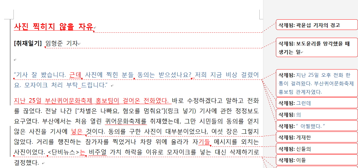 오늘은 임형준 기자의 '취재일기'입니다. 지난달 24일 부산퀴어문화축제 현장기사가 나간 이후 항의전화를 받았다고 합니다.