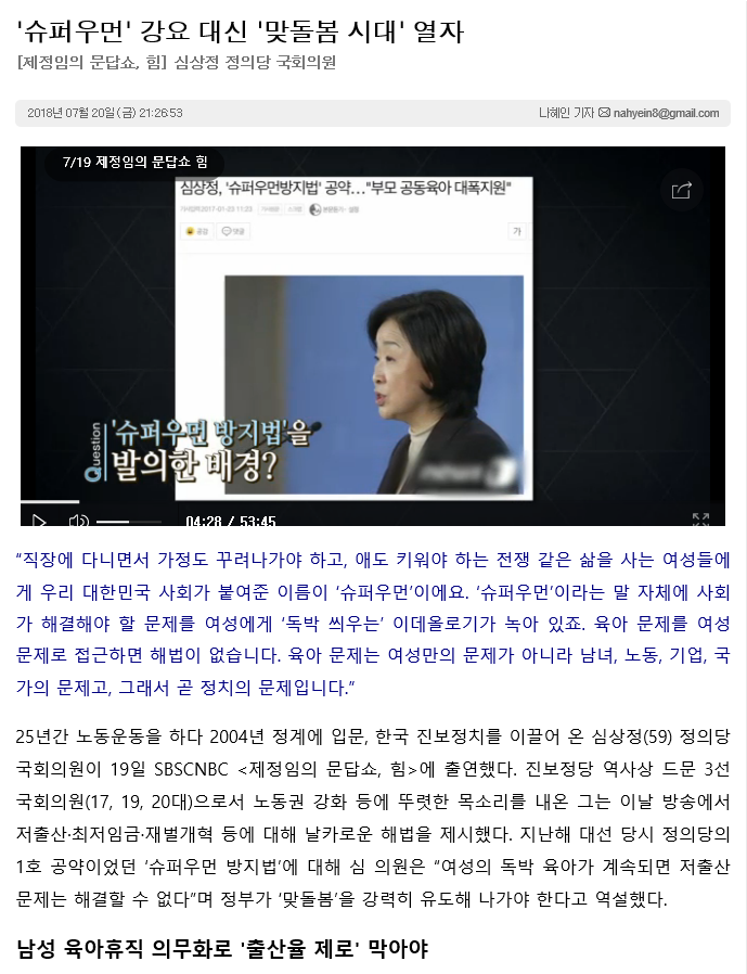 본문 시작 게시판 대학원소개 교수/학생소개 교과과정 입학/학사안내 공지사항 게시판 저널리즘연구소 홈페이지가이드 단비뉴스 편집실 단비뉴스 편집실 단비서재 세저리 이야기 언론사 채용공고 언론계 동향 언시 후기 사진첩 언론 현장에서 단비뉴스 편집실 페이스북 트위터 프린트 '슈퍼우먼' 강요 대신 '맞돌봄 시대' 열자 조현아 조회 : 3089 등록일 : 2018-07-20 목록 이전나만 프랑스 축구팀을 응원한 이유 다음 노동시간만 줄인다고 쉴 수 있나 댓글수 1개 조현아 2018-07-20 22:25:20기사전문을 확인하려면 아래 링크를 클릭하세요!http://www.danbinews.com/news/articleView.html?idxno=10524 * 작성자 * 내용 댓글은 로그인 후에 이용해 주세요. 로그인