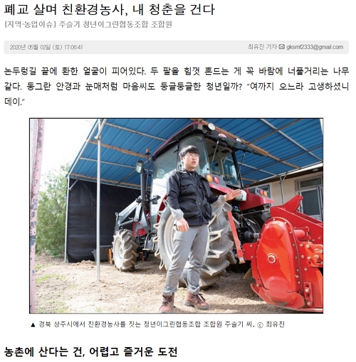 오늘 준비한 기사는 최유진 기자의 <폐교 살며 친환경농사, 내 청춘을 건다>입니다. 자세한 내용은 기사를 통해 확인하세요! 댓글도 환영합니다~