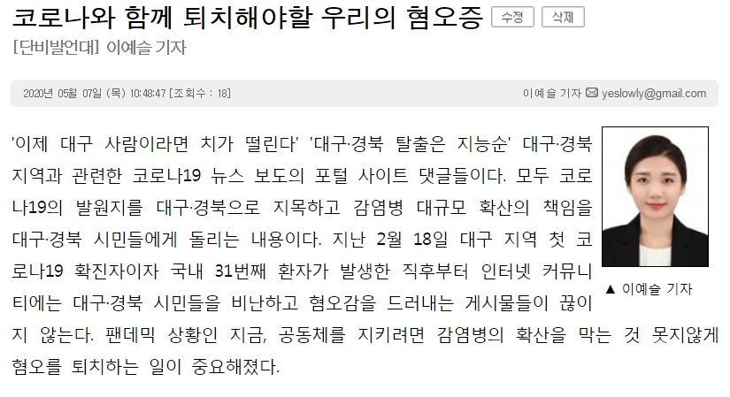 <단비뉴스>에 올라오는 기사의 원본과 최종본은 얼마나 차이날까요? 교수님들이 어떻게 기사와 영상을 수정하셨는지 배우고 싶으면 이곳 "단비뉴스 편집실"에 자주 들어오세요. 첨삭한 원본과 수정본, 그리고 교수님들의 코멘트를 보실 수 있습니다. 오늘 준비한 기사는 이예슬 기자의 <코로나와 함께 퇴치해야할 우리의 혐오증>입니다. 자세한 내용은 기사를 통해 확인하세요! 댓글도 환영합니다~