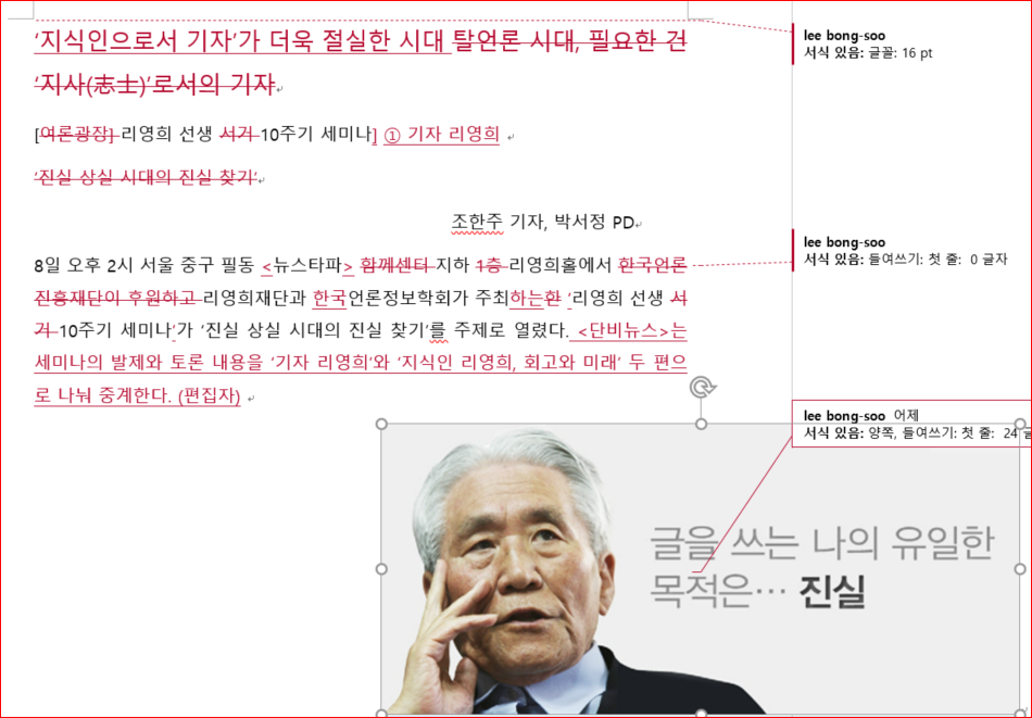 <단비뉴스>에 올라오는 기사의 원본과 최종본은 얼마나 차이 날까요? 교수님들이 어떻게 기사와 영상을 수정하셨는지 배우고 싶으면 이곳 "단비뉴스 편집실"에 자주 들어오세요. 첨삭한 원본과 수정본, 그리고 교수님들의 코멘트를 보실 수 있습니다.