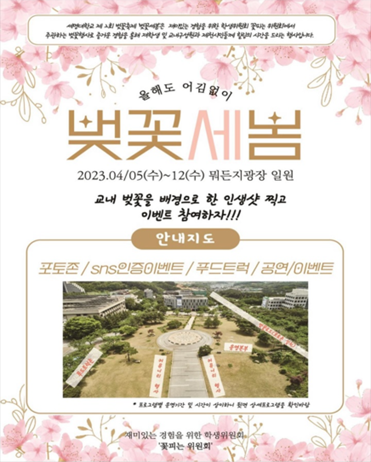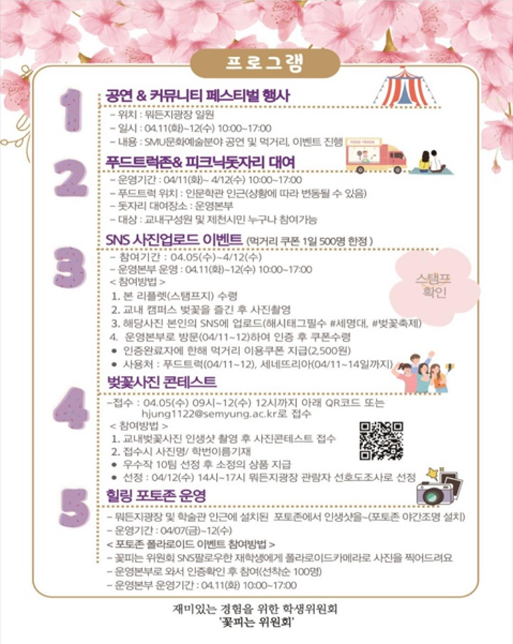본문 시작 홈으로 커뮤니티 학과소개 교수소개 학과과정 커뮤니티 대학원 홈페이지가이드 포토갤러리 공지사항 채용정보 포토갤러리 Youtube 바로가기 Instargram 바로가기 Blog 바로가기 Facebook 바로가기 포토갤러리 페이스북 트위터 프린트 🌸 벚꽃세봄 🌸 뷰티케어학 2510 2023-04-04 일정 : 2023.04.05 (수) ~ 2023.04.12 (수) 장소 : 뭐든지 광장 일원 🌸 세명대학교가 제2회 벚꽃축제 “벚꽃세봄”은 재미있는 경험을 위한 학생위원회 ‘꽃피는 위원회’에서 주관하는 벚꽃 행사입니다! 재학생 및 교내 구성원과 제천시민 분들께 힐링을 드립니다 :) 🌸 벚꽃 사진 콘테스트, 포토존, 돗자리 대여, 즐거운 공연까지! 다양한 행사와 즐거움이 가득한 행사를 즐겨보세요😆 목록 다음 세명대학교 등록금 환불제 다음 🎊세명대학교 제 30회 청룡축전🎊