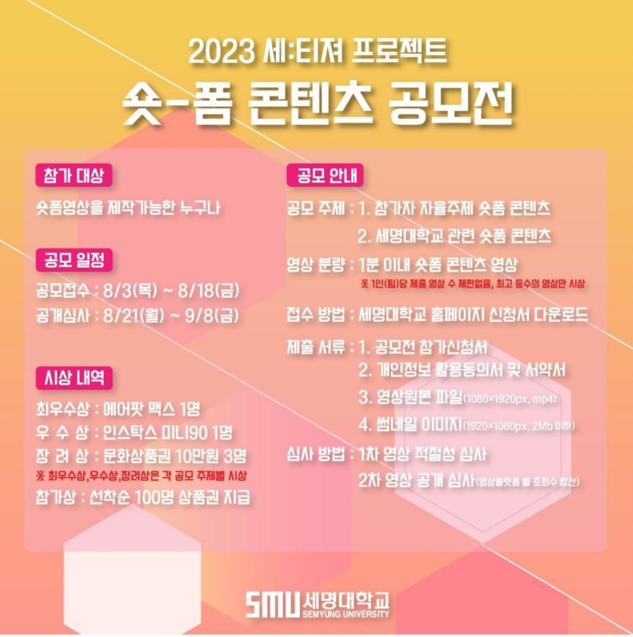 본문 시작 홈으로 커뮤니티 학과소개 교수소개 학과과정 커뮤니티 대학원 홈페이지가이드 포토갤러리 공지사항 채용정보 포토갤러리 Youtube 바로가기 Instargram 바로가기 Blog 바로가기 Facebook 바로가기 포토갤러리 페이스북 트위터 프린트 2023 세:티져 프로젝트 숏폼 콘텐츠 공모전 뷰티케어학 2665 2023-08-03 2023 세:티져 프로젝트 숏폼 콘텐츠 공모전 숏폼영상을 만들 수 있는 누구나 참여가능!! 세명대학교와 관련한 주제 또는 일상에서의 자율주제로 영상을 제작하여 공모전에 참여하고, 에어팟맥스, 인스탁스, 문화상품권 등 다양한 상품을 받아가 보세요~ 목록 다음 🌻2023년도 2학기 수강신청 안내 🌻 다음 청주 더한 뷰티 미용학원 입시설명회