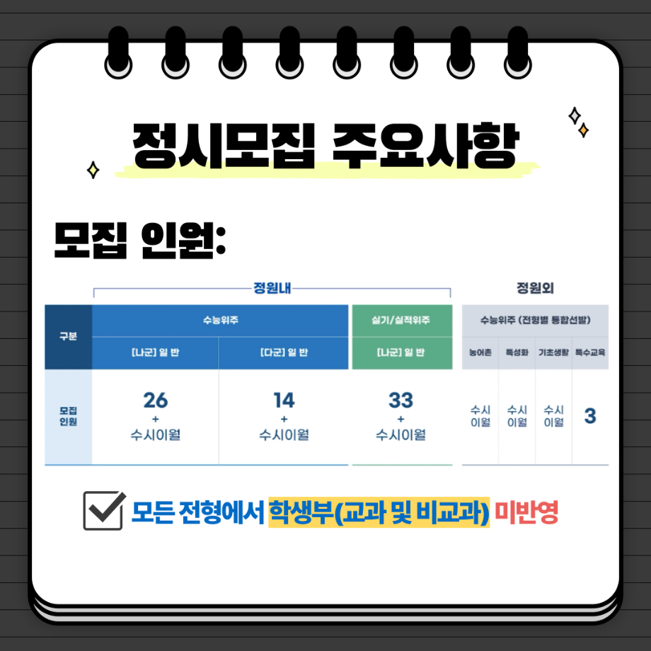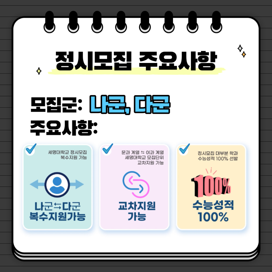 본문 시작 홈으로 커뮤니티 학과소개 교수소개 학과과정 커뮤니티 대학원 홈페이지가이드 포토갤러리 공지사항 채용정보 포토갤러리 Youtube 바로가기 Instargram 바로가기 Blog 바로가기 Facebook 바로가기 포토갤러리 페이스북 트위터 프린트 세명대학교 2024학년도 정시모집 안내 뷰티케어학 2785 2023-11-28 2024학년도 정시모집 안내입니다. 원서접수 기간을 비롯한 주요 사항이 나와 있으니 꼭! 확인하시기 바랍니다:) 목록 이전2024학년도 세명대학교 수시모집 최초합격자 등록 안내 다음 더 가까워진 세명대학교!