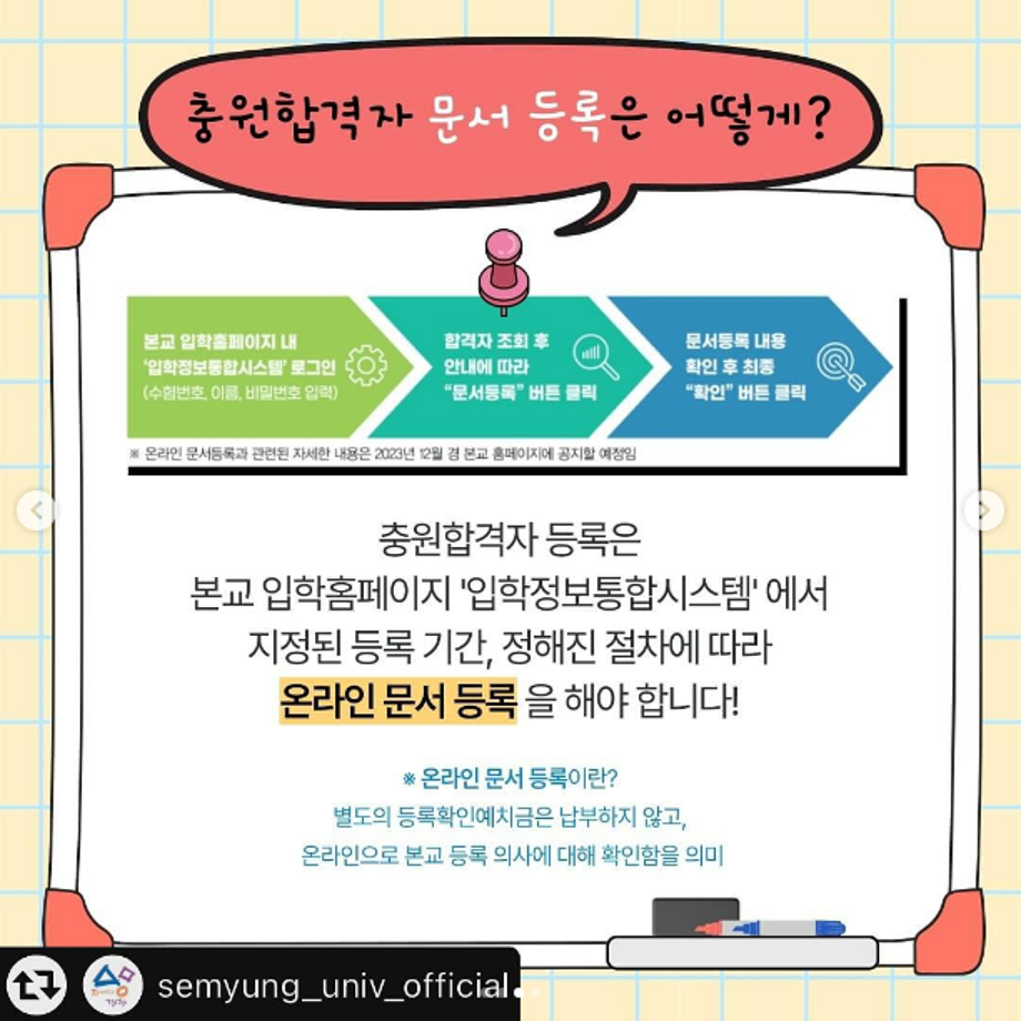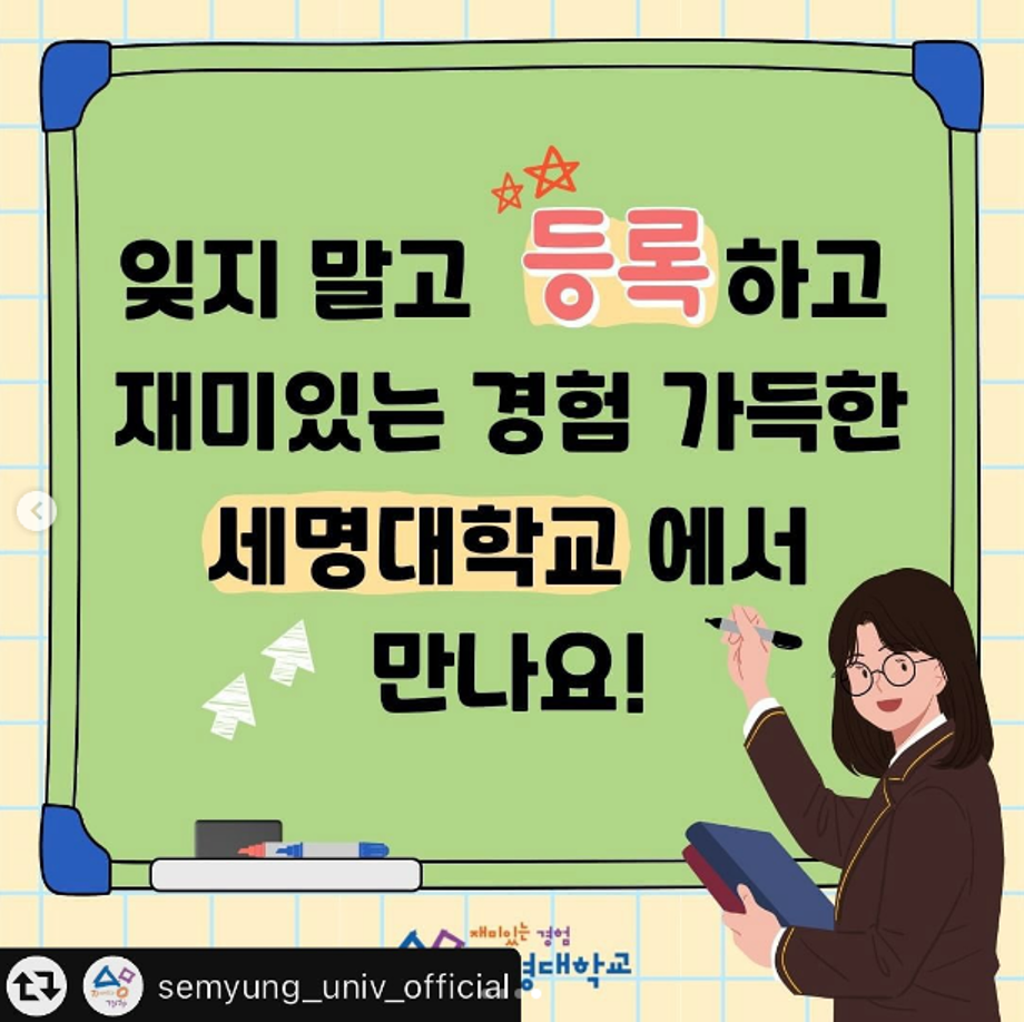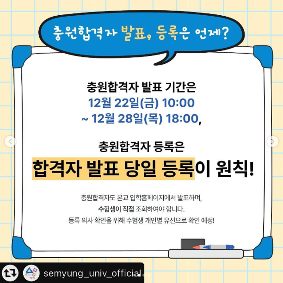 본문 시작 홈으로 커뮤니티 학과소개 교수소개 학과과정 커뮤니티 대학원 홈페이지가이드 포토갤러리 공지사항 채용정보 포토갤러리 Youtube 바로가기 Instargram 바로가기 Blog 바로가기 Facebook 바로가기 포토갤러리 페이스북 트위터 프린트 📢 2024학년도 세명대학교 수시모집 충원합격자 발표 및 등록 안내 뷰티케어학 2722 2023-12-22 2024학년도 수시모집 충원합격자 발표 및 등록 안내입니다👍 ✔12월 22일(금) 10:00부터 28일(금) 18:00✔까지 충원합격자 발표! 충원합격자 등록은 👉합격자 발표 당일 등록!!👈 잊지 말고 등록하고 ✨재미있는 경험 가득한 💙세명대학교💙에서 만나요! 목록 다음 더 가까워진 세명대학교! 다음 세명대학교도 지구를 위해 함께합니다!
