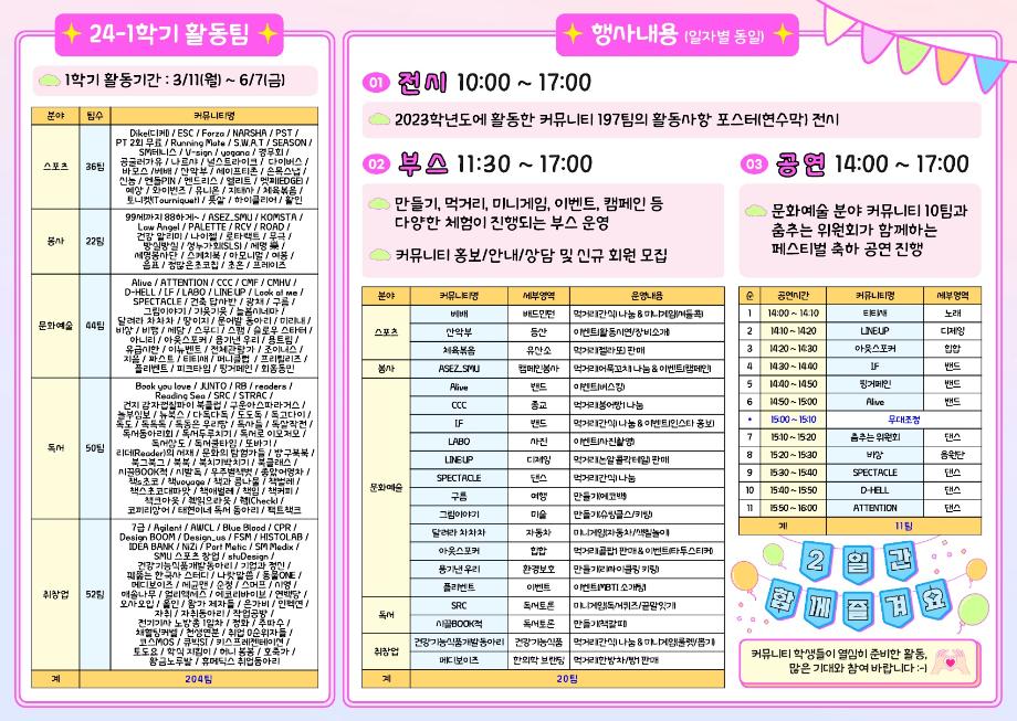 본문 시작 홈으로 커뮤니티 학과소개 교수소개 학과과정 커뮤니티 대학원 홈페이지가이드 포토갤러리 공지사항 채용정보 포토갤러리 Youtube 바로가기 Instargram 바로가기 Blog 바로가기 Facebook 바로가기 포토갤러리 페이스북 트위터 프린트 커뮤니티 페스티벌✨ 뷰티케어학 1853 2024-04-01 커뮤니티 페스티벌 4월 2~3일 봄을 맞아 새로운 행사가 열립니다! 여러 부스 활동들과 먹거리, 공연등이 펼쳐지니 많은 관심과 참여 부탁드립니다:) 전시,부스 종류와 공연시간등을 잘 참고하셔서 즐기시길 바래요✨ 전시-10:00~17:00 부스-11:30~17:00 공연-14:00~16:00 📍뭐든지 광장 (위치는 지도 참고) 목록 이전💫모듈형 교육과정 뷰티영양학 토론수업💫 다음 벚꽃세봄✨