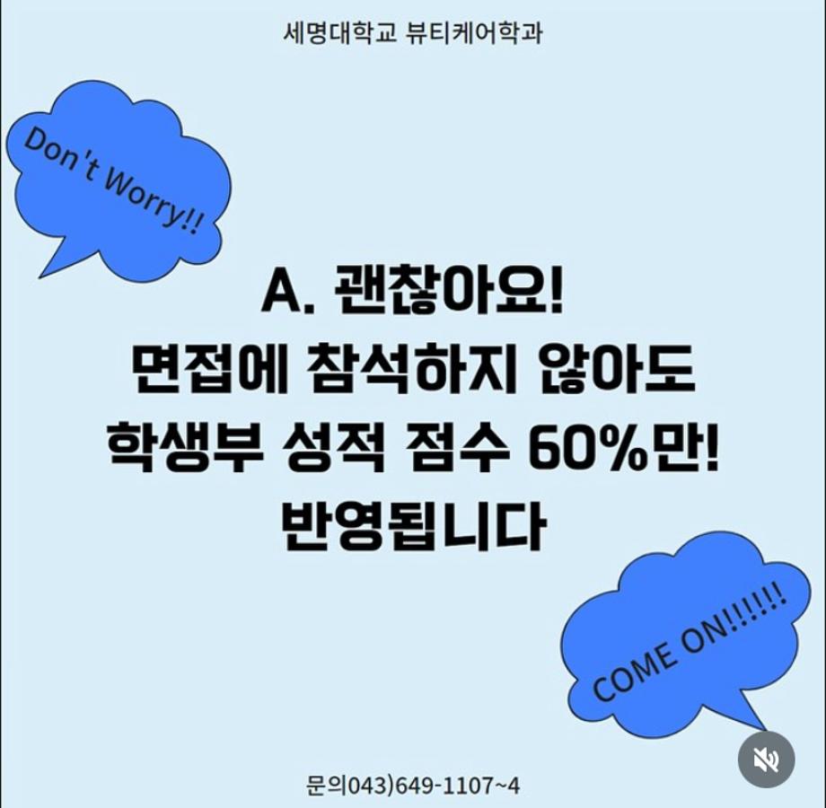 본문 시작 홈으로 커뮤니티 학과소개 교수소개 학과과정 커뮤니티 대학원 홈페이지가이드 포토갤러리 공지사항 채용정보 포토갤러리 Youtube 바로가기 Instargram 바로가기 Blog 바로가기 Facebook 바로가기 포토갤러리 페이스북 트위터 프린트 면접 우수자 전형 바이오코스메틱학과 1740 2024-10-02 📍면접우수자전형 면접에 응시하지 않아도! 괜찮습니다! 걱정하시마세요~ 다만 면접에 참석하지 않을시, 학생부 성적 점수 60%만 반영되니까 꼭 알아두고! 충분히 생각하고 결정합시다!! . 목록 이전043-649-1637 / 2025학년도 예비 신입생 여러분들께 수시 입시 무료 응시쿠폰(진학사,유웨이어플라이무료)을 드립니다. 다음 📣 2025 세명대학교 “뷰티케어학과” 면접우수자전형 면접 일정 📣