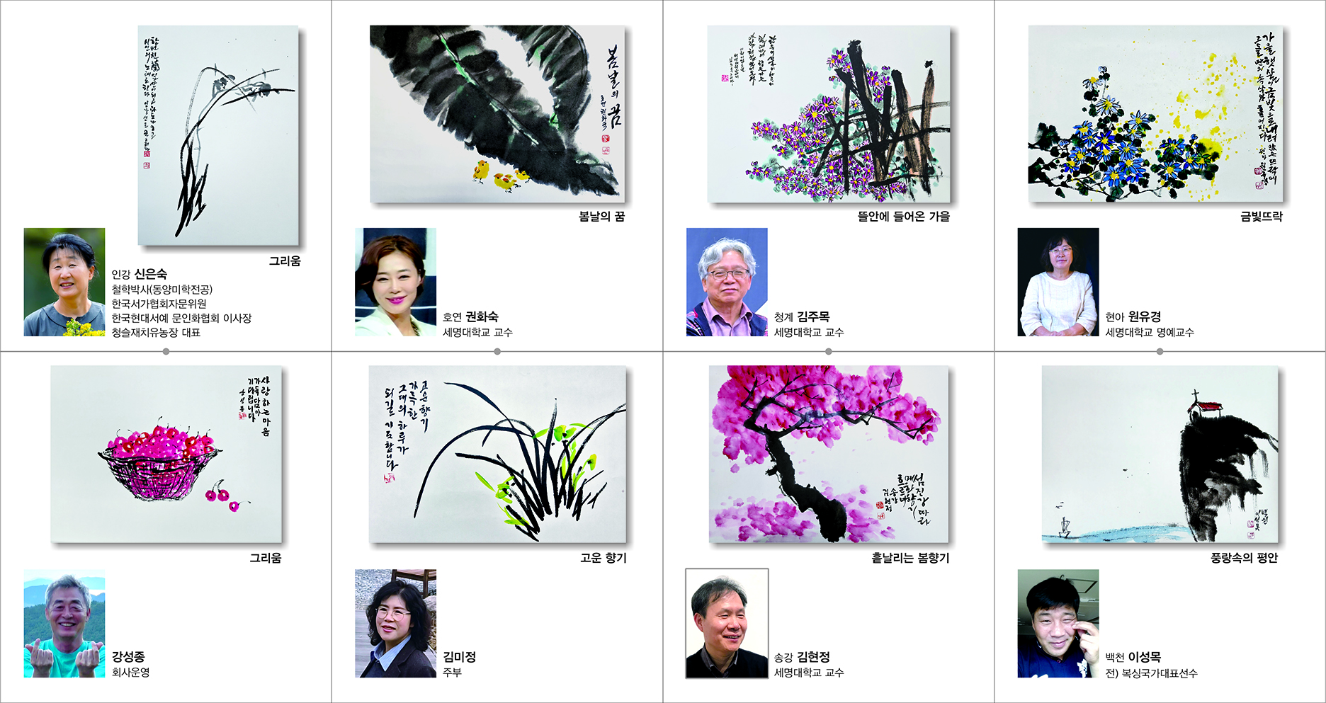 본문 시작 홈으로 MCC News 학과소개 교수소개 학과과정 MCC News MCC SNS 홈페이지가이드 교수 및 졸업생 학과 및 재학생 교수 및 졸업생 미디어 정보통 교수 및 졸업생 페이스북 트위터 프린트 권화숙 교수님 향기로운 삶, 문인화 전시회 안내 미디어콘텐츠창작학과 186 2025-12-04 향기로운 삶,문인화' 강좌 수강생들의 그동안의 배움과 성과를 공유하는 2025년 제5회 문인화전 – 「여백의 시간을 거닐다 II」 전시회를 개최합니다. 📍 전시 안내 [일시] 개막식: 2025년 12월 4일(목) 16:00 전시기간: 2025년 12월 4일(목) 16:00–18:00 2025년 12월 5일(금)–12월 8일(월) 10:00–17:00 [장소] 제천시민회관 2층 전시실(충북 제천시 의림대로 125) 목록 이전권화숙 교수님, 공연 「허재비고블린의 꿈」 출연 담당부서 : 미디어콘텐츠창작학과 담당자 : - 연락처 : 043-649-1741 최종수정일 : 2024-10-26 만족도조사 만족도 조사 이 페이지에서 제공하는 정보에 대하여 만족하시나요? 매우만족 만족 보통 불만족 매우불만족