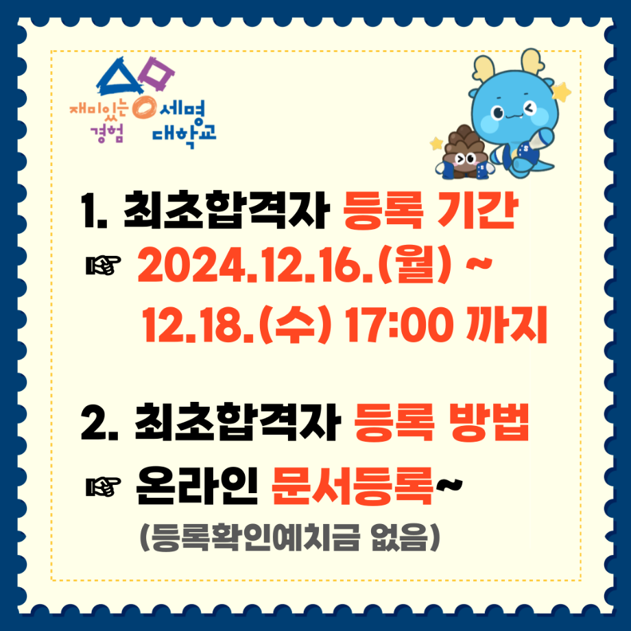 본문 시작 홈으로 커뮤니티 학과소개 교수소개 교육과정 커뮤니티 홈페이지가이드 포토갤러리 학과공지 학사일정 채용정보 및 자료 학생회 포토갤러리 포토갤러리 페이스북 트위터 프린트 세명대학교 재난안전학과 2025학년도 수시모집 최초합격자 등록 안내 재난안전학과 2441 2024-12-17 세명대학교 재난안전학과 2025학년도 수시모집 최초합격자 등록 안내 수시모집 최초 합격자 발표 안내 입니다..[자세한 내용 클릭] 목록 이전2024년 청소년 빅콘서트 전공체험 프로그램 운영 다음 세명대학교 재난안전학과 2025학년도 수시모집 충원 합격자 안내 만족도조사 만족도 조사 이 페이지에서 제공하는 정보에 대하여 만족하시나요? 매우만족 만족 보통 불만족 매우불만족