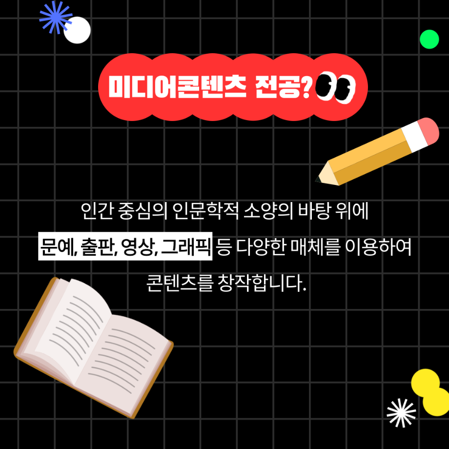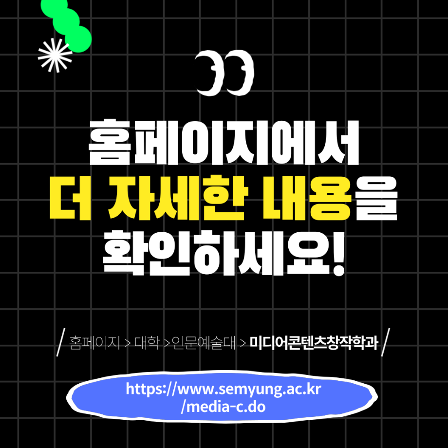 본문 시작 홈으로 MCC News 학과소개 교수소개 학과과정 MCC News MCC SNS 홈페이지가이드 미디어 정보통 학과 및 재학생 교수 및 졸업생 미디어 정보통 미디어 정보통 페이스북 트위터 프린트 미디어콘텐츠창작학과 궁금해?! 미디어콘텐츠창작학과 810 2025-07-21 🎥미디어콘텐츠창작학과❗️궁금해❓📖 영상부터 출판, 그래픽, 소설까지! 내 아이디어를 콘텐츠로 만드는 곳. 창작의 모든 과정을 직접 경험하고, 나만의 이야기를 세상에 전하세요✨ 자세한 내용은 미콘창 인스타그램에서 확인하세요 @smu_mcc 목록 이전여름방학 갈만한 여행지 추천.zip 다음 2025 시청자미디어대상 방송영상공모전 담당부서 : 미디어콘텐츠창작학과 담당자 : - 연락처 : 043-649-1741 최종수정일 : 2024-10-26 만족도조사 만족도 조사 이 페이지에서 제공하는 정보에 대하여 만족하시나요? 매우만족 만족 보통 불만족 매우불만족