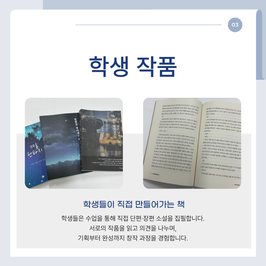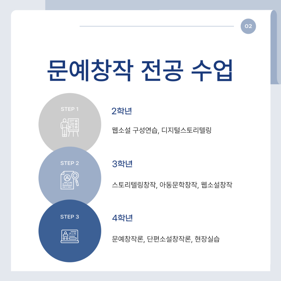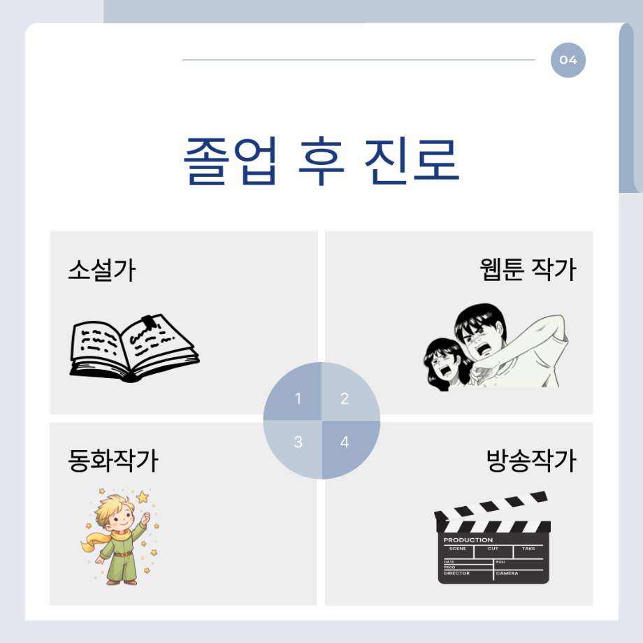 본문 시작 홈으로 MCC News 학과소개 교수소개 학과과정 MCC News MCC SNS 홈페이지가이드 미디어 정보통 학과 및 재학생 교수 및 졸업생 미디어 정보통 미디어 정보통 페이스북 트위터 프린트 📖 미디어콘텐츠창작학과 | 소설 전공 미디어콘텐츠창작학과 781 2025-08-25 한 문장에 담긴 상상, 한 이야기로 완성되는 세계. 소설 전공에서는 기초 글쓰기부터 장르소설, 장편 창작까지 글쓰기의 전 과정을 배우며 실력을 쌓아갑니다. 작품 집필, 합평 수업, 출판 연계 활동을 통해 스토리텔링 능력과 창작 역량을 키우고, 작가·출판 기획자·콘텐츠 스토리텔러 등 다양한 진로로 나아갈 수 있습니다. 목록 이전📖미디어콘텐츠창작학과 | 출판 전공 다음 백억커피 x 곰믹스 AI 활용 영상 공모전 담당부서 : 미디어콘텐츠창작학과 담당자 : - 연락처 : 043-649-1741 최종수정일 : 2024-10-26 만족도조사 만족도 조사 이 페이지에서 제공하는 정보에 대하여 만족하시나요? 매우만족 만족 보통 불만족 매우불만족